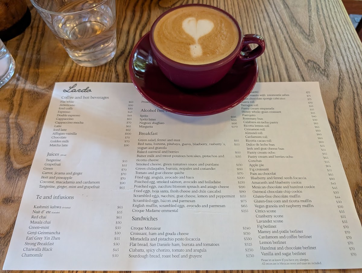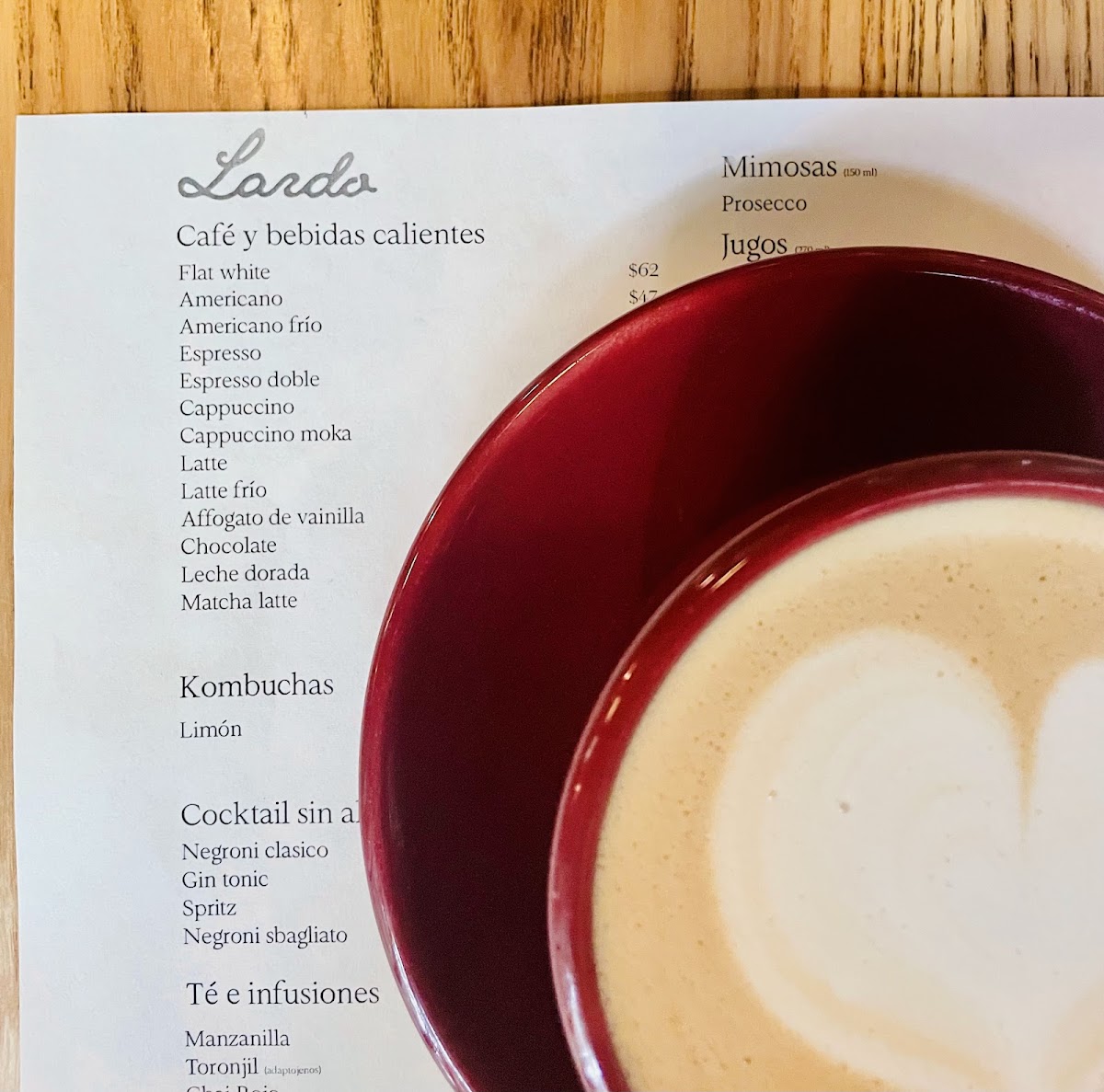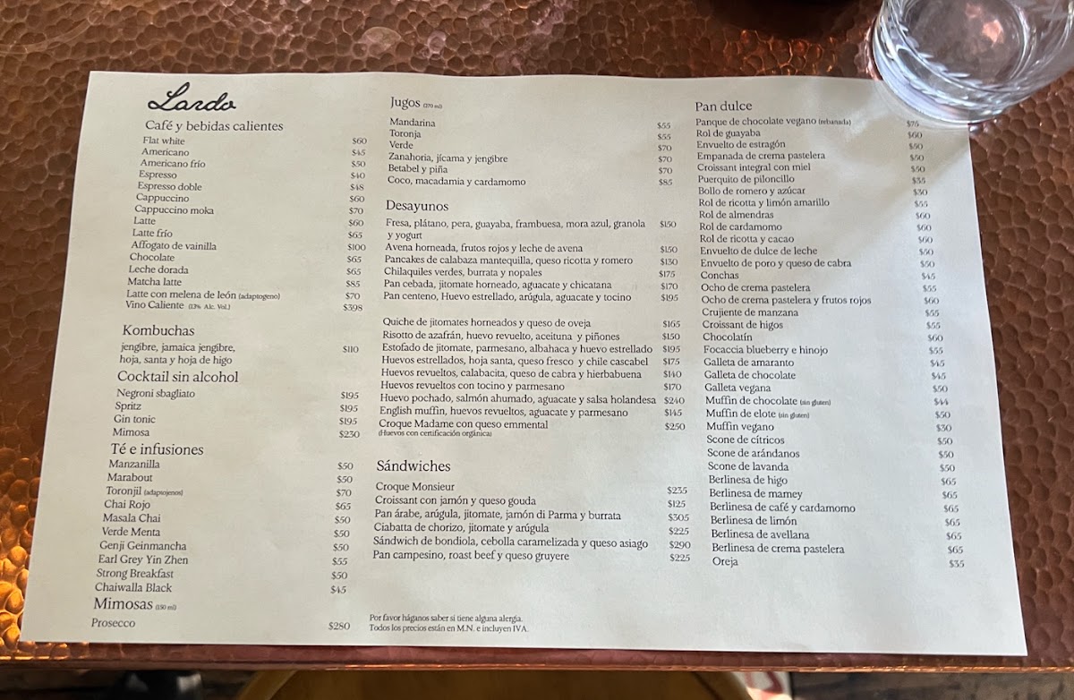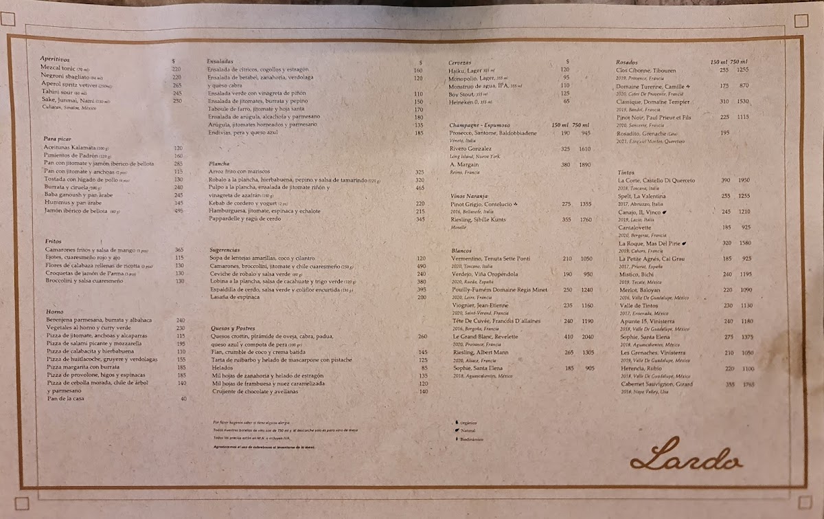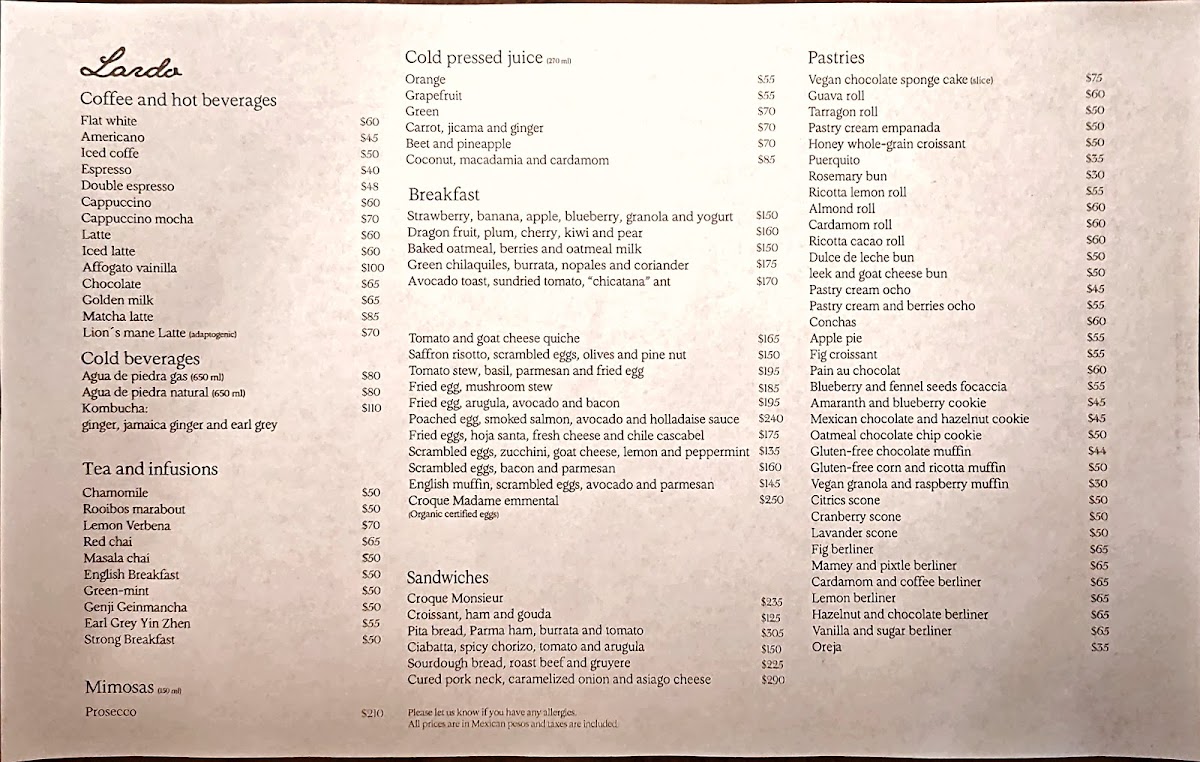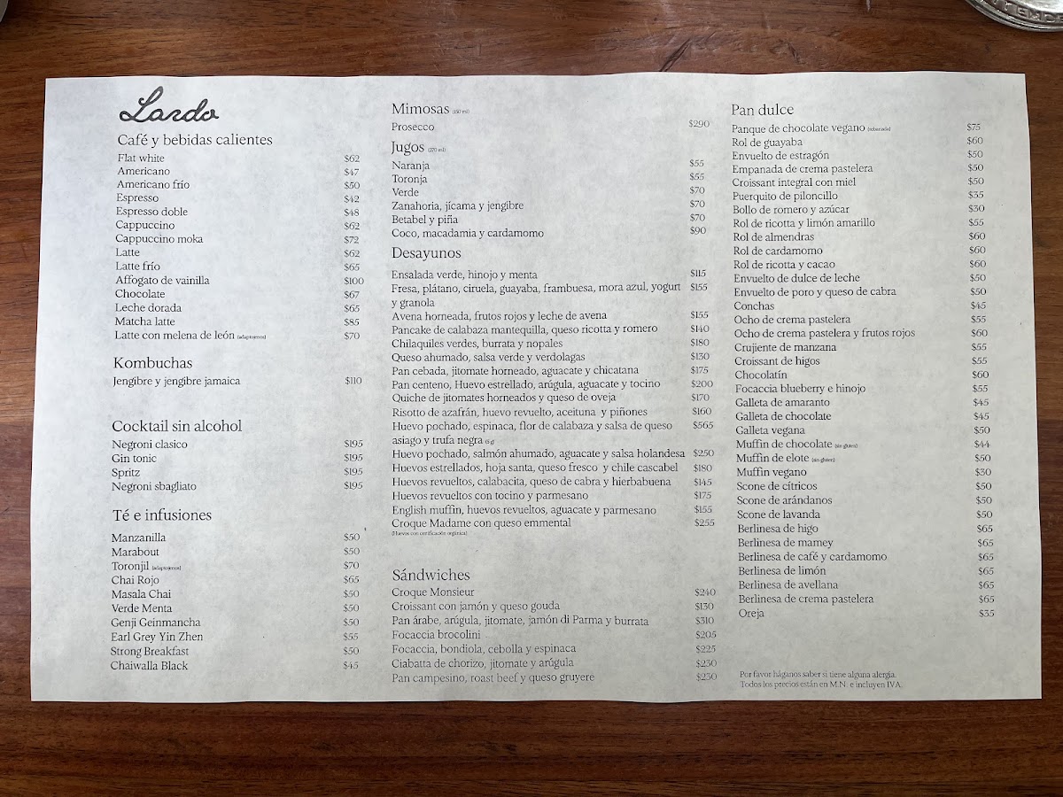 The menu at Lardo offers a variety of Mediterranean-inspired dishes with a focus on brunch options, available in Colonia Condesa, Ciudad de México. The selection is structured to include egg-based dishes, baked goods, light meals, and a variety of beverages including teas and infusions.